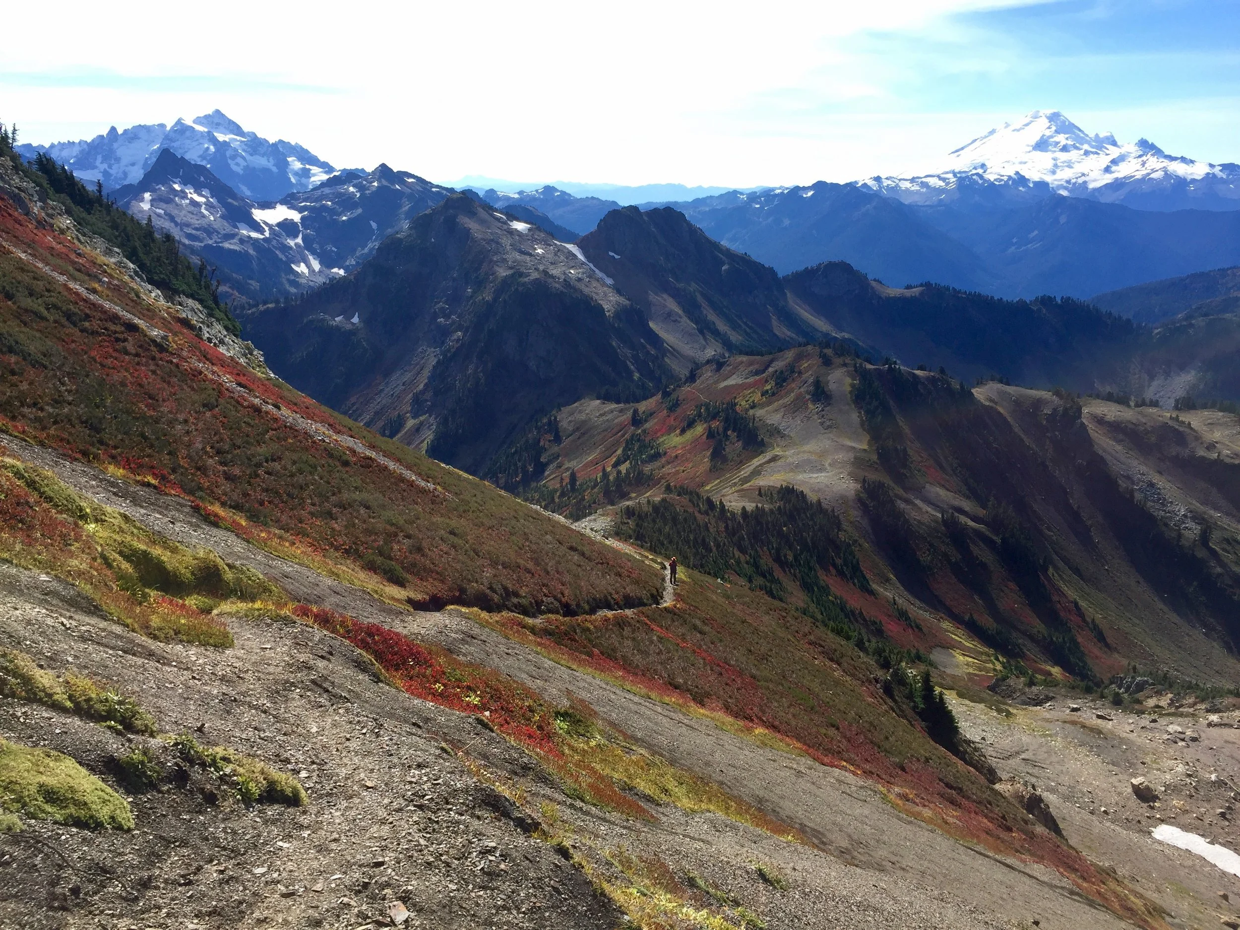 As we crested the ridge at Low Pass we not only had a great view of our destination but also new views to the south. Beautiful Mount Baker dominated the scene but also Yellow Aster Butte, Tomyhoi Peak and the entire length of the lovely Nooksack Ridge.