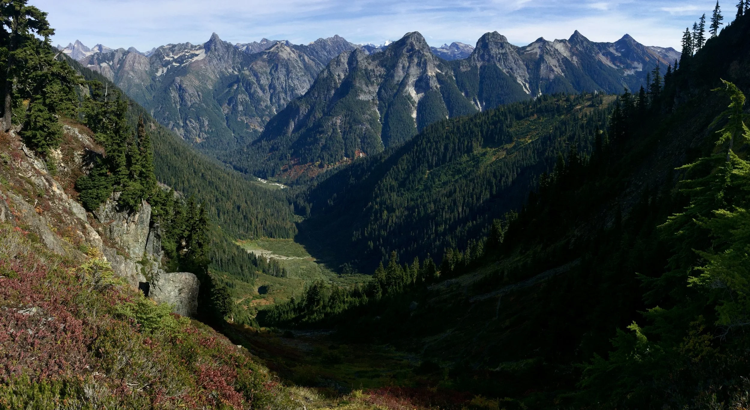 After a steep section of long switchbacks up through a hillside of hard dirt, we made it to a saddle high on a shoulder coming off of Mount Larrabee. A short climb from the saddle put us at the top of a bare knoll at about 6,800’. Wow! Behind us Larrabee towered. The Pleaides' jagged pinnacles connected to Larrabee. To the north were tons of peaks in Canada that I have no idea the names of. To the east we were gazing into the entire northern unit of North Cascades National Park. We could name most of the peaks in that direction and spotted several peaks and areas we had been to previously.
