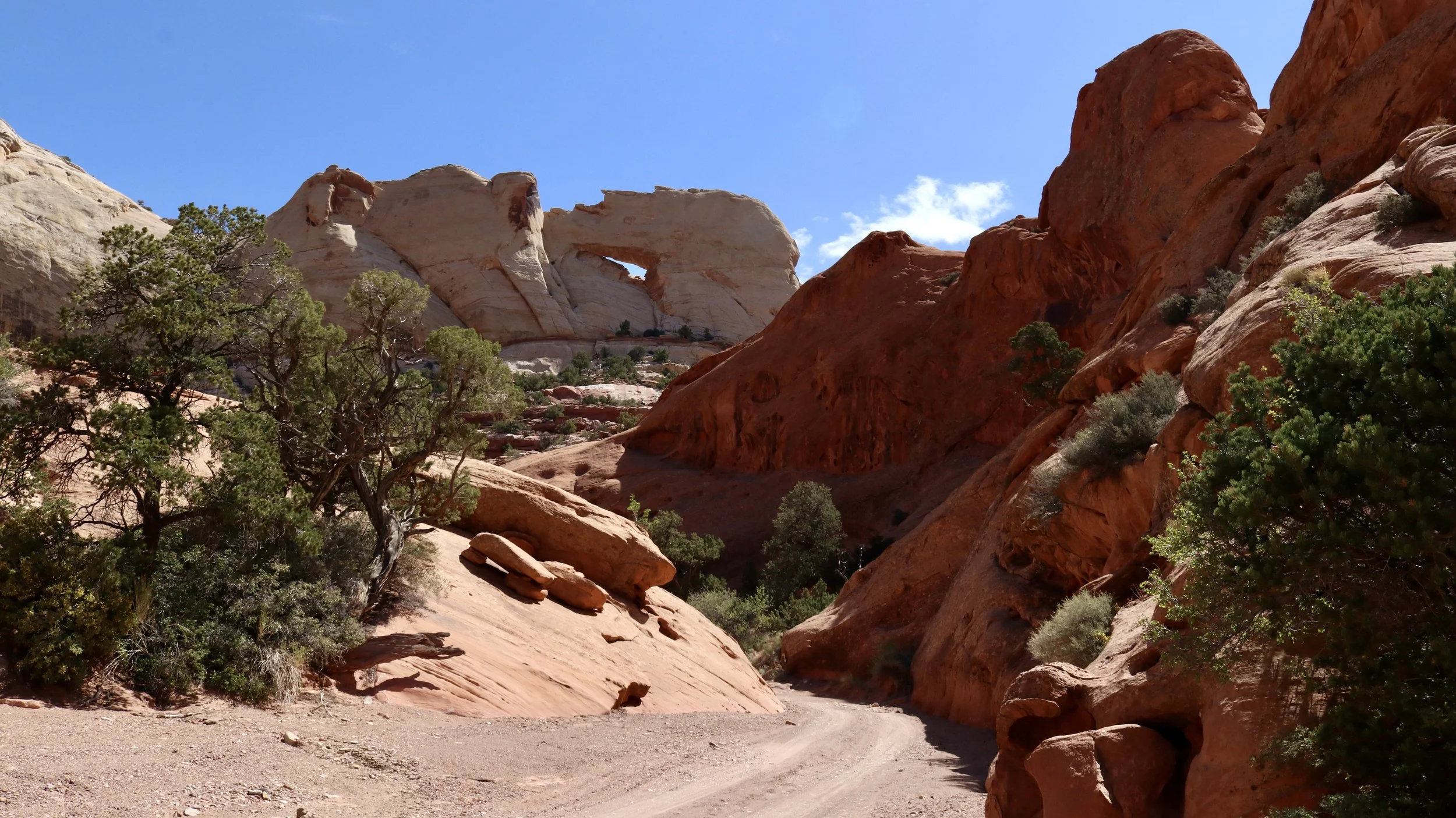 Back on the Burr Trail, the scenery was simply outstanding and we stopped numerous times for photos. At 32.8 miles from Boulder, shortly after the road became a dirt road we came to the turnoff to Upper Muley Twist Canyon. This 4WD road goes 2.9 miles up a narrow canyon wash past a couple of arches to a trailhead called Strike Valley Overlook. The weather was great, we were both giddy with the adventure bug so we threw the Jeep into 4WD and turned up the wash. Even from the turnoff we could see a large window in a white cliff up ahead. The road was bumpy and a bit rocky but nothing too difficult as we made our way around tight corners and up the middle of the wash. After rounding several turns we came upon Trinity Double Arch on our left. We had to stop and hike up underneath it to fully see both arches. Before long we made it to the Strike Valley Overlook Trailhead. There was one other vehicle there but no sign of its owner.