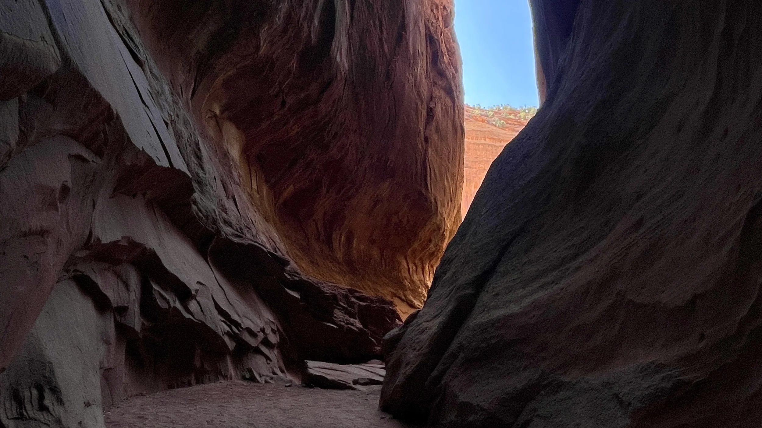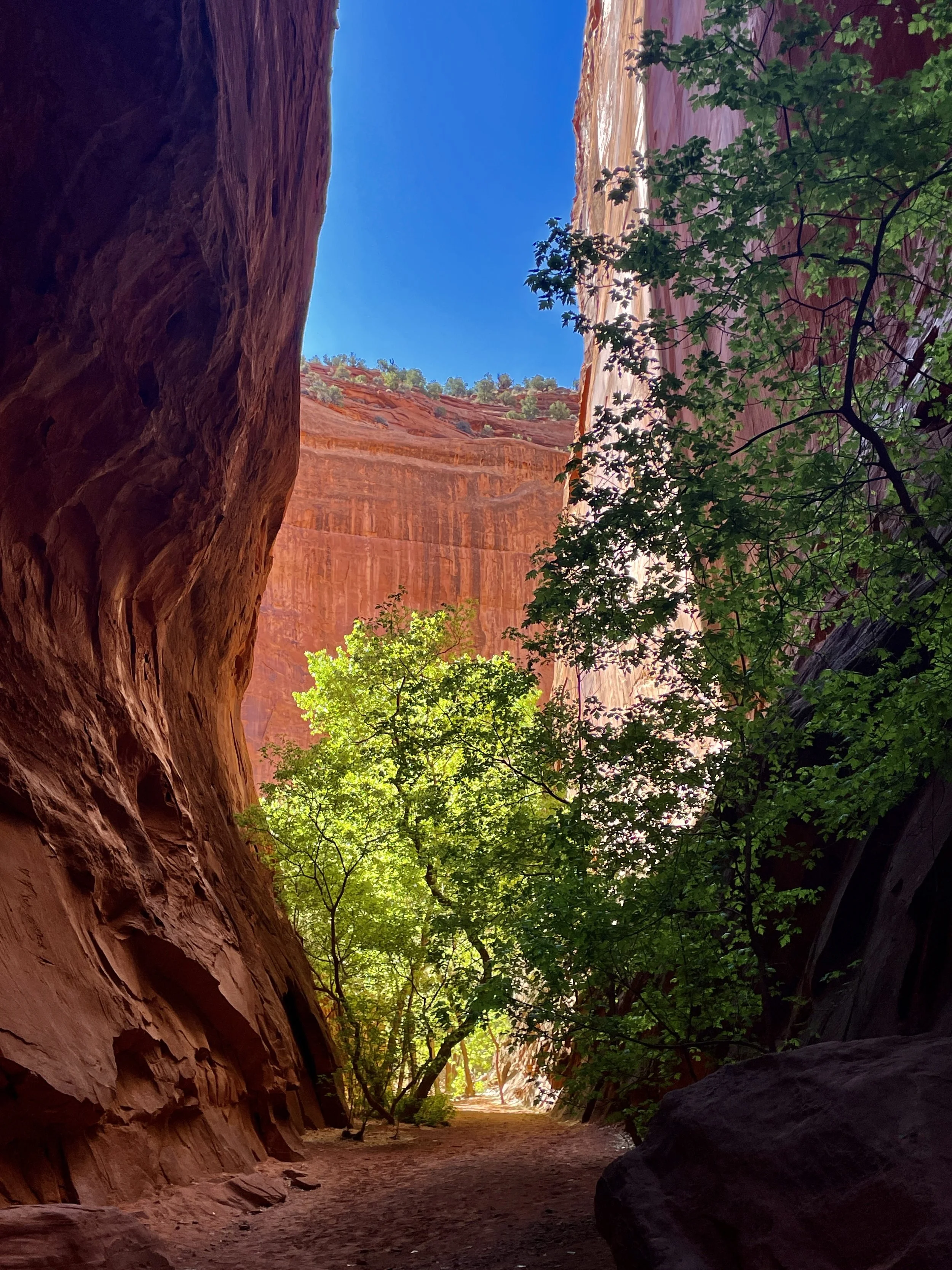 We dropped into Long Canyon and flanked by high orange cliffs on both sides, we stopped eleven miles from Boulder at an unmarked pullout. Just off the road here was a short slot canyon called Singing Canyon. There were no trail signs but I had found this in my pre-trip research. The hike is only a couple of hundred yards long, but the walls are very high and bright green cottonwoods add contrast to the orange walls. It is called Singing Canyon due to the unusually great acoustics inside the canyon. I had almost considered bringing my guitar and playing a tune or two but decided not to bother.