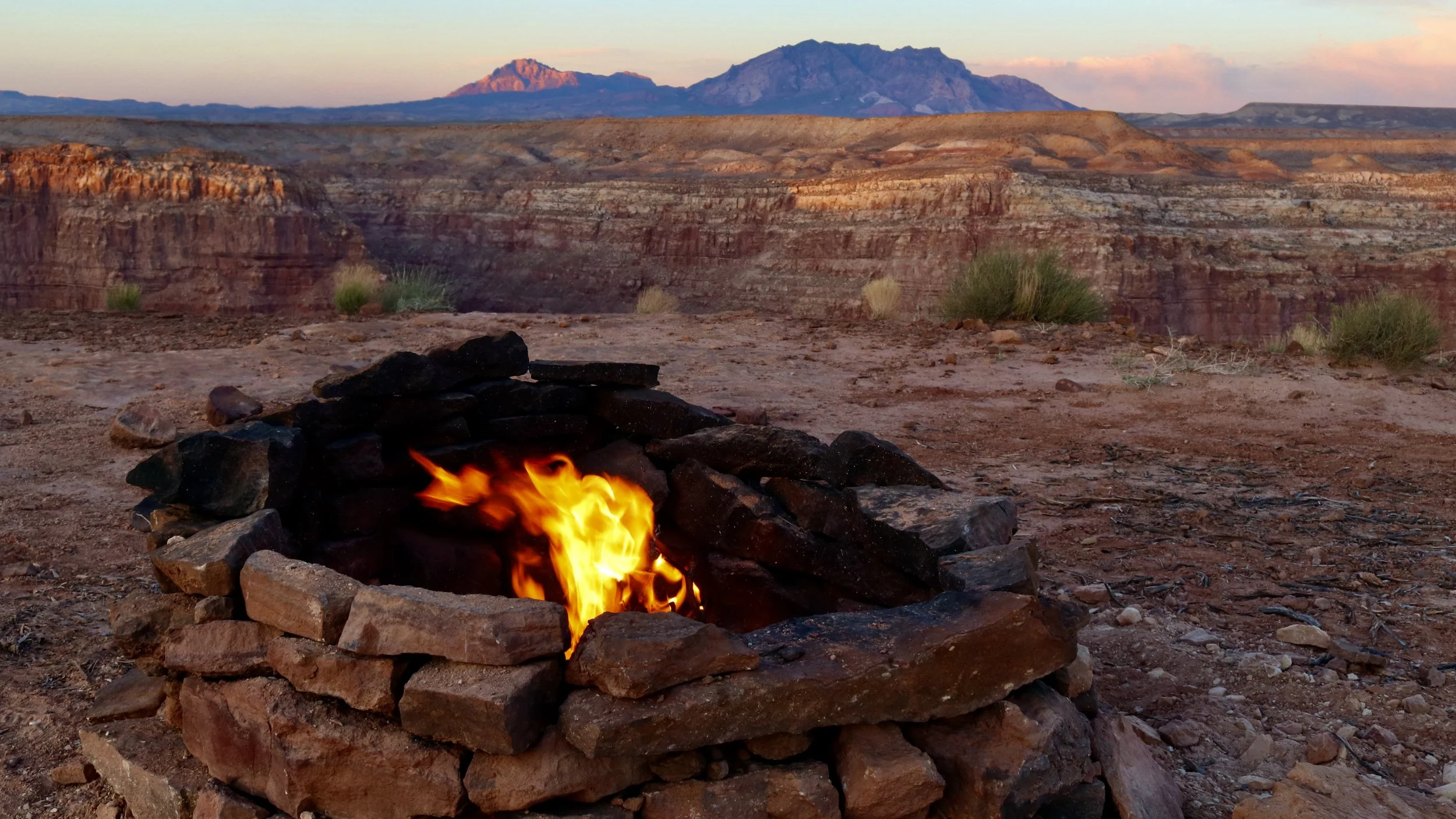 Our toasty fire overlooking Bullfrog Canyon with the Henry Mountains behind