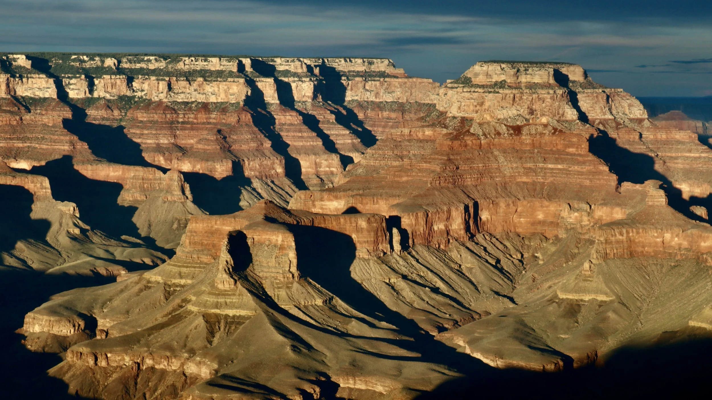 Bear in mind that this was the first time Bridgit and I had ever laid eyes on the Grand Canyon. The immense span and depth were incredible. The sun was still behind a thick layer of clouds so the whole canyon was in shadow but I could see a good line of blue sky underneath the cloud cover stretching down to the rim. We waited and watched and as the sun sank lower it slowly emerged from beneath the clouds and just lit up the canyon walls with rich evening light. It was a perfect sunset and one of the better sunsets we have ever seen.