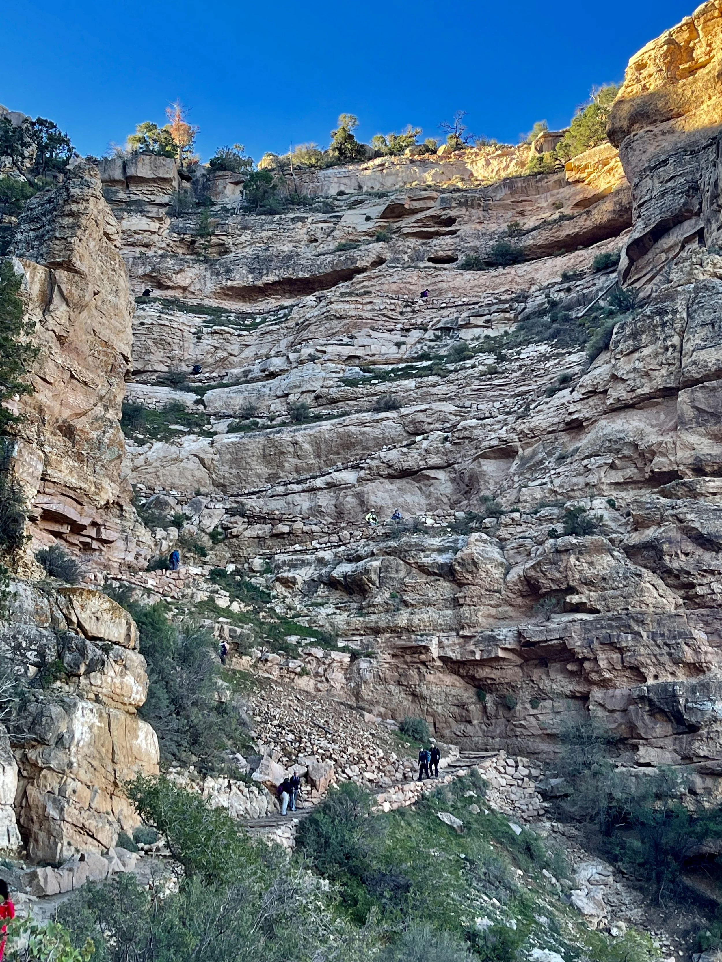 The following morning was our thirtieth wedding anniversary. Watching the sun rise over the Grand Canyon seemed like an epic way to celebrate so Gina, Bridgit and I caught the 6AM shuttle out to the Kaibab Trailhead. There were about thirty other people on the shuttle, some of whom planned to hike down to the river and back up again. It is 6.3 miles down the Kaibab Trail to the Colorado River and you descend 4,860’ along the way. To make it a loop some planned to hike over to the Bright Angel Trail and ascend back up to the south rim that way. That loop is a total of 16.5 miles and of course you have to climb all that elevation lost on the way down as you ascend back up to the south rim. Another popular hike is what is known as a true rim to rim hike where you go down from the south rim and ascend to the north rim. Since the north rim is at a higher elevation there is even more distance and elevation gain for this endeavor. If I had insisted on doing that, our thirtieth anniversary would have very likely been our last.