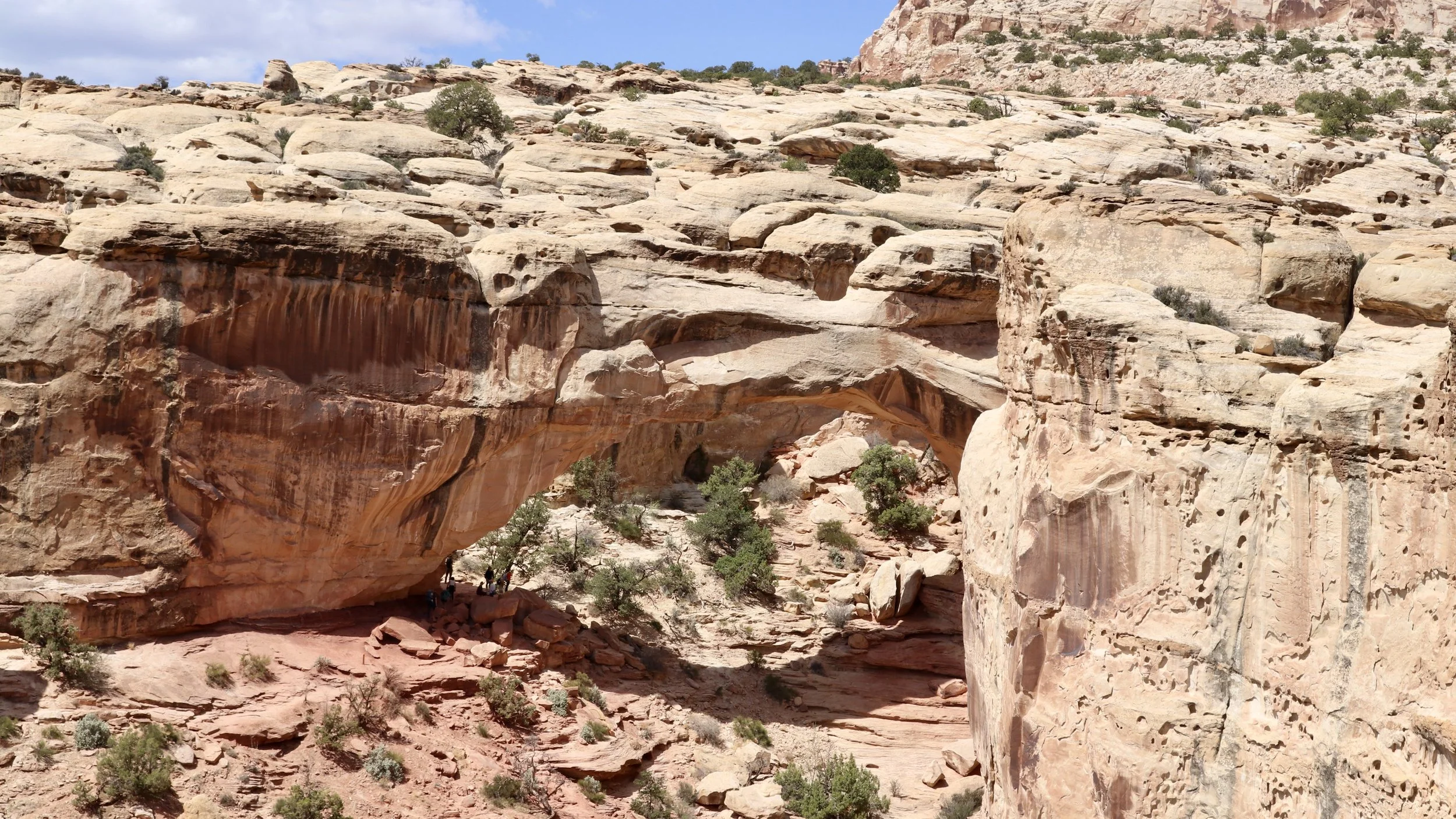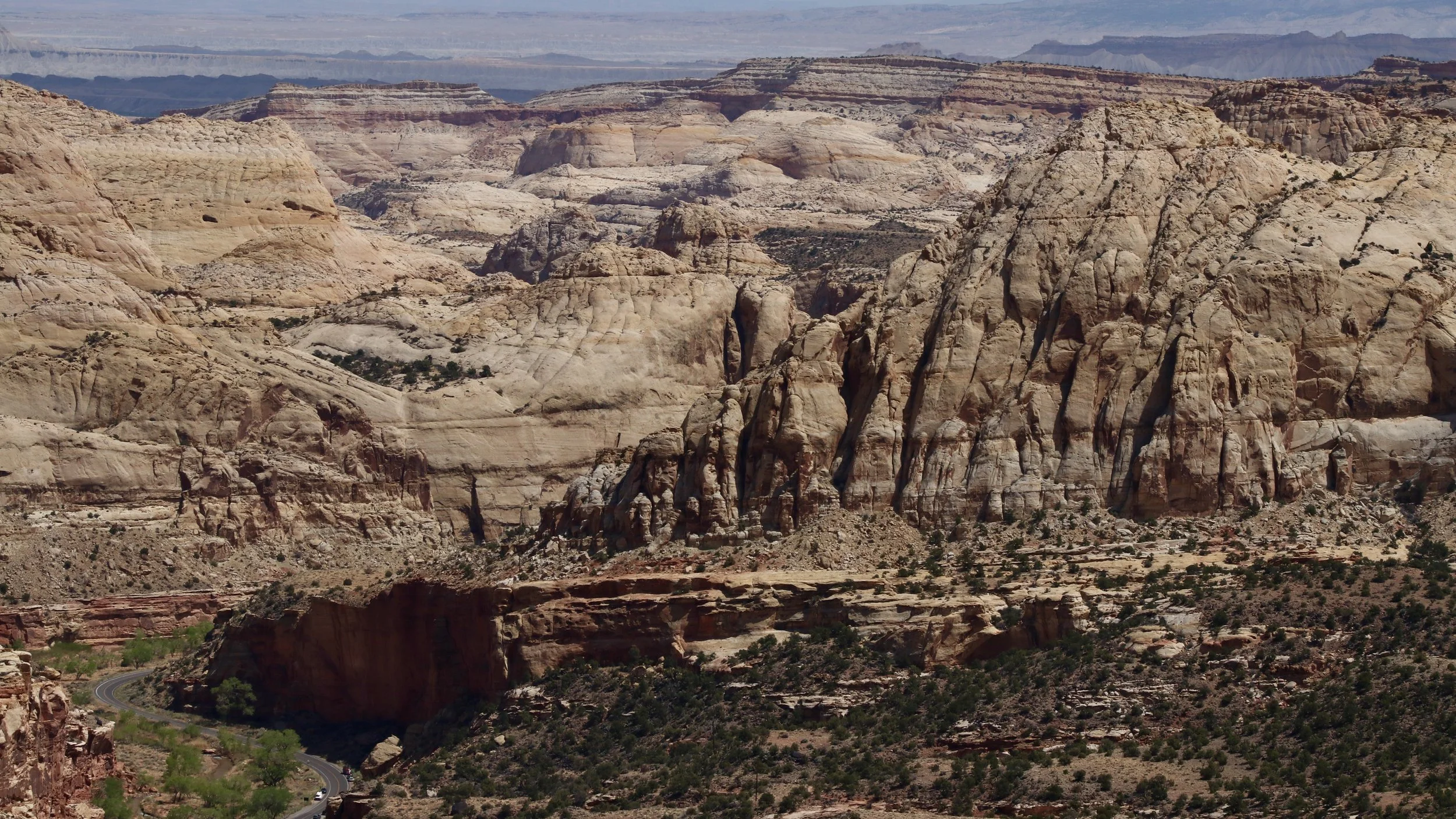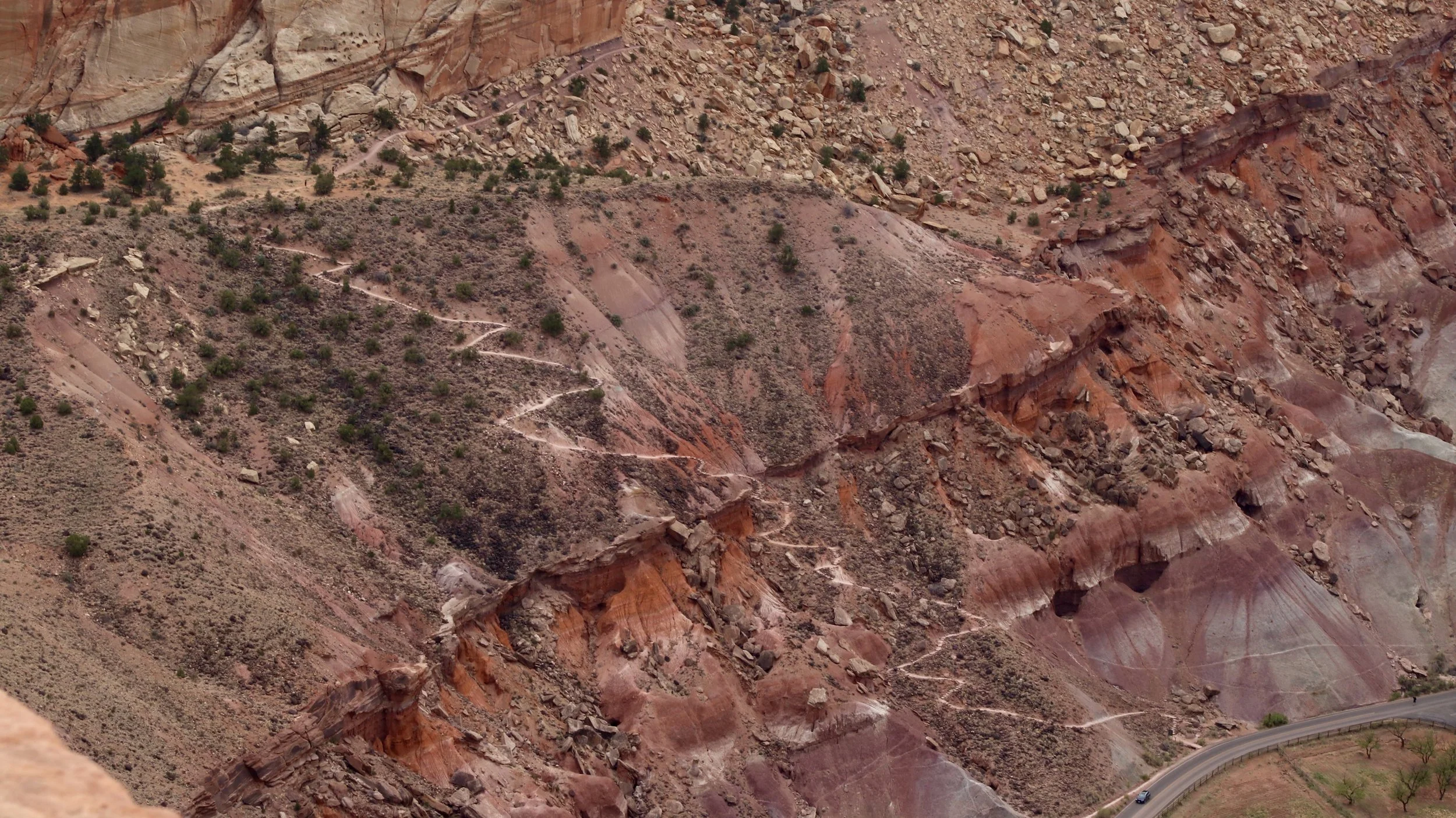 We arrived at Rim Overlook around one and hung out for about forty-five minutes. We had great views looking down to the visitor center, the Fruita campground, the Pendleton Barn next to the Gifford House and the Cohab Canyon trail.