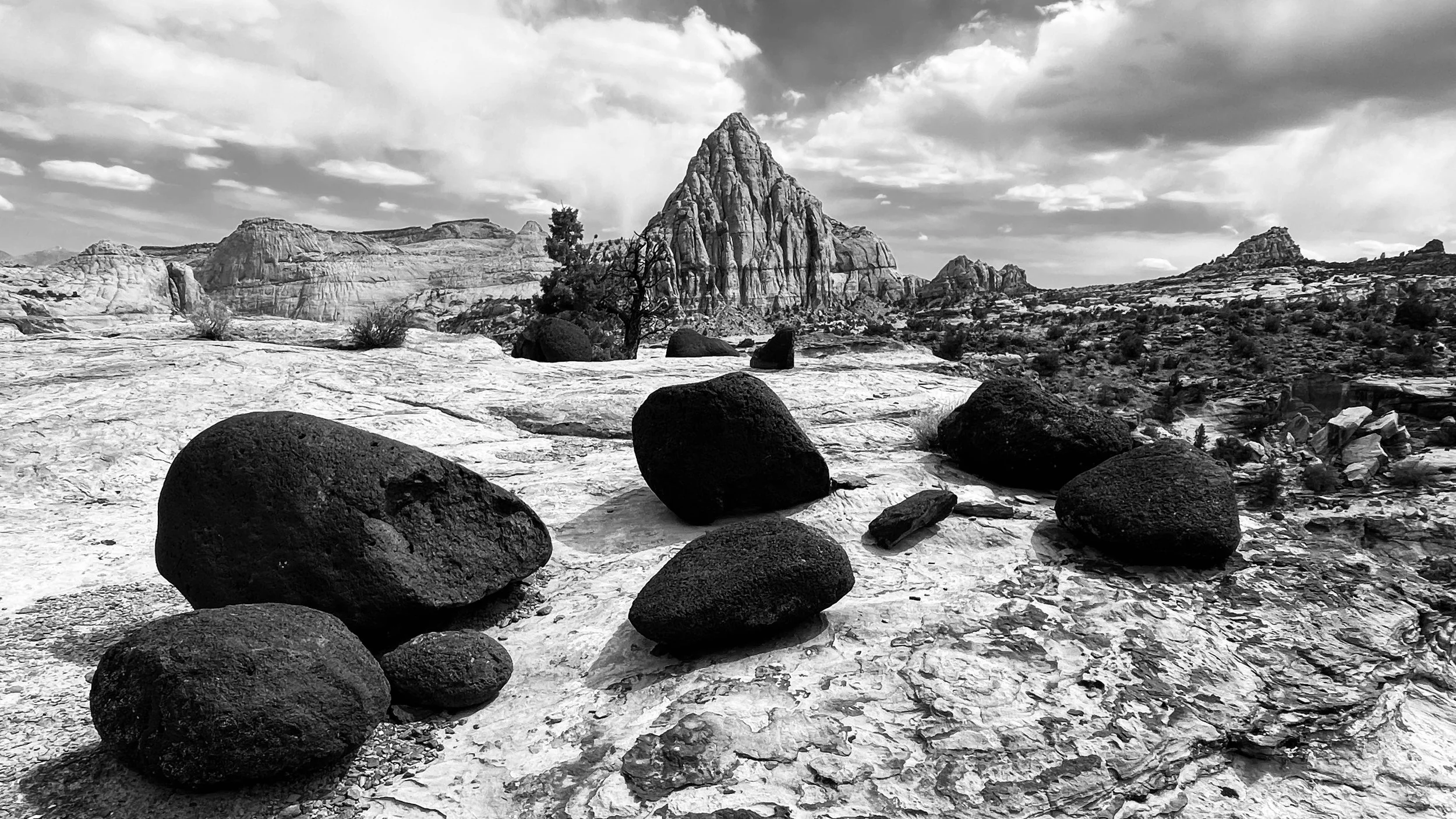 A long time ago I had seen a photo of Pectols Pyramid with large black bowling ball sized round rocks in the foreground. It was a beautiful composition and ever since I had been eager to hike up to Rim Overlook and find that spot. On the way up I never found it and even though I had thought it was taken from Rim Overlook, it was clear that the photo must have been further back on the trail. As we descended, Pectols Pyramid began to look more like the perfect pyramid I had seen in the photo. Then I spotted a hill just above the trail and it was covered in these black rocks. As I climbed up to the spot I knew this was where I’d seen the view in the photo. The black rocks made for a great foreground and Pectols Pyramid is just a beautiful mountain subject. I took both color and monochrome shots. I will post both for comparison but I think the monochrome really came out nicely.