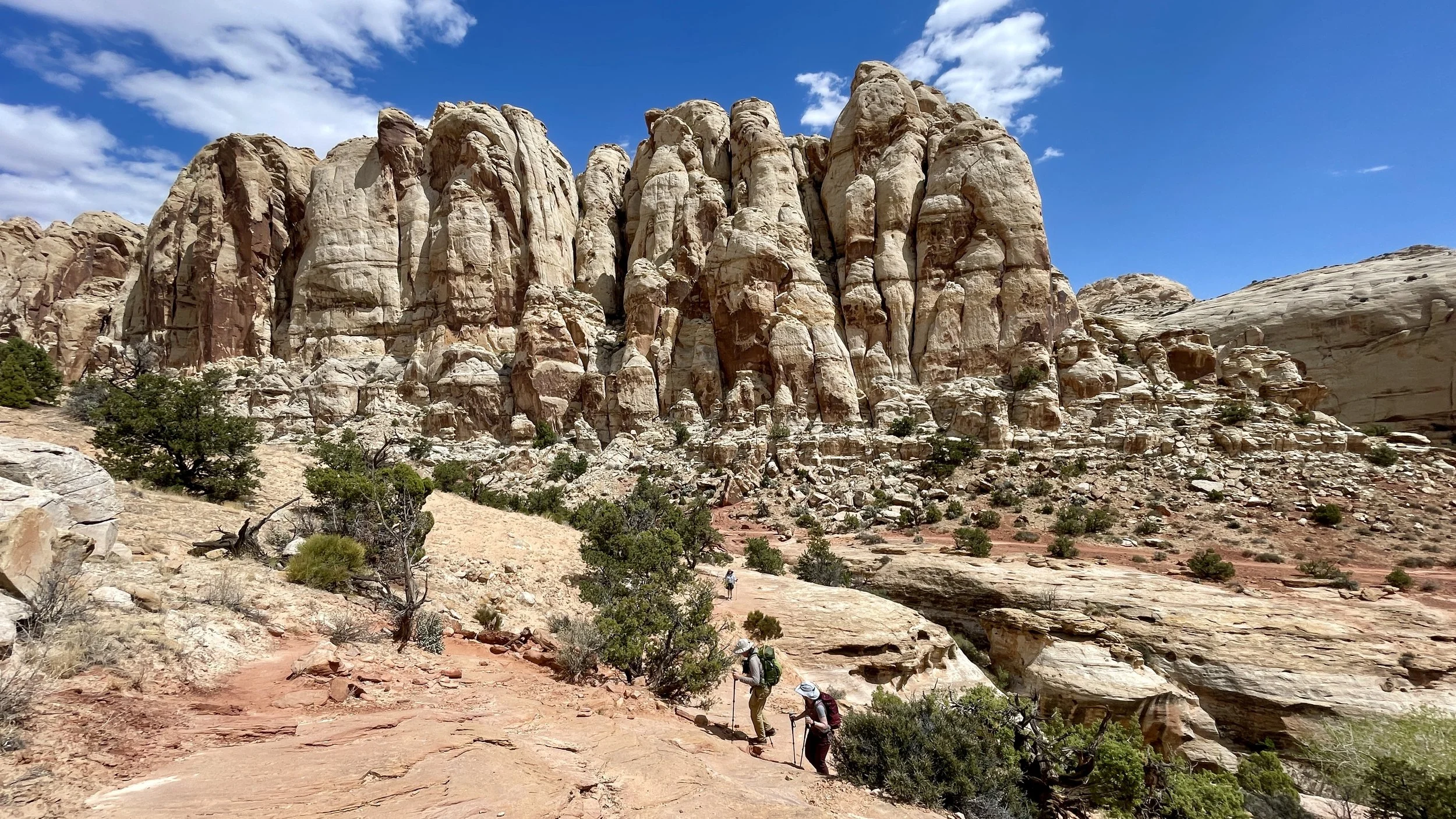 From the end of the ridge, we dropped down and crossed over to the base of the huge orange cliffs. Soon we came to a junction with another trail that drops down into Spring Canyon. This is supposedly a very beautiful hike in its own right, but it will have to wait for our next visit to Capitol Reef.