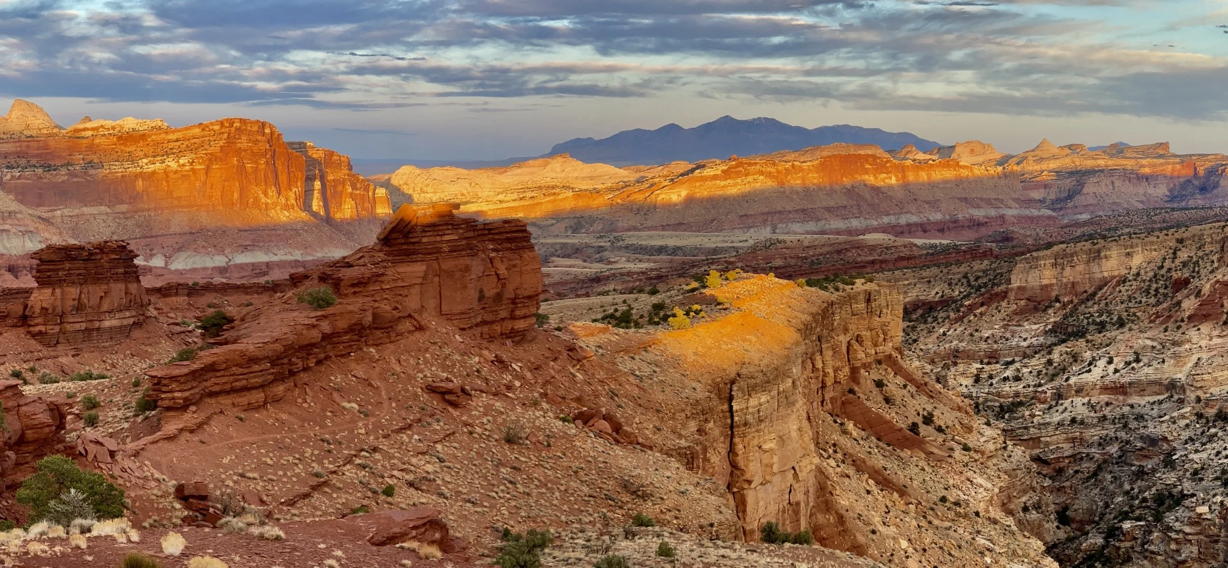 Easy hiking put us on top of a long ridge above Chimney Rock. We followed the ridge east to the far end and almost sucked wind at how great the view from there was. Not only were we looking at huge orange cliffs right in front of us, but we could now see towards the Fruita District and the uplift of the Waterpocket Fold running along the Scenic Drive. I had thought that Sunset Point was a great spot to photograph the sunset and it is, but the short hike to this spot would be the ultimate sunset photo spot under the right conditions. Wow!