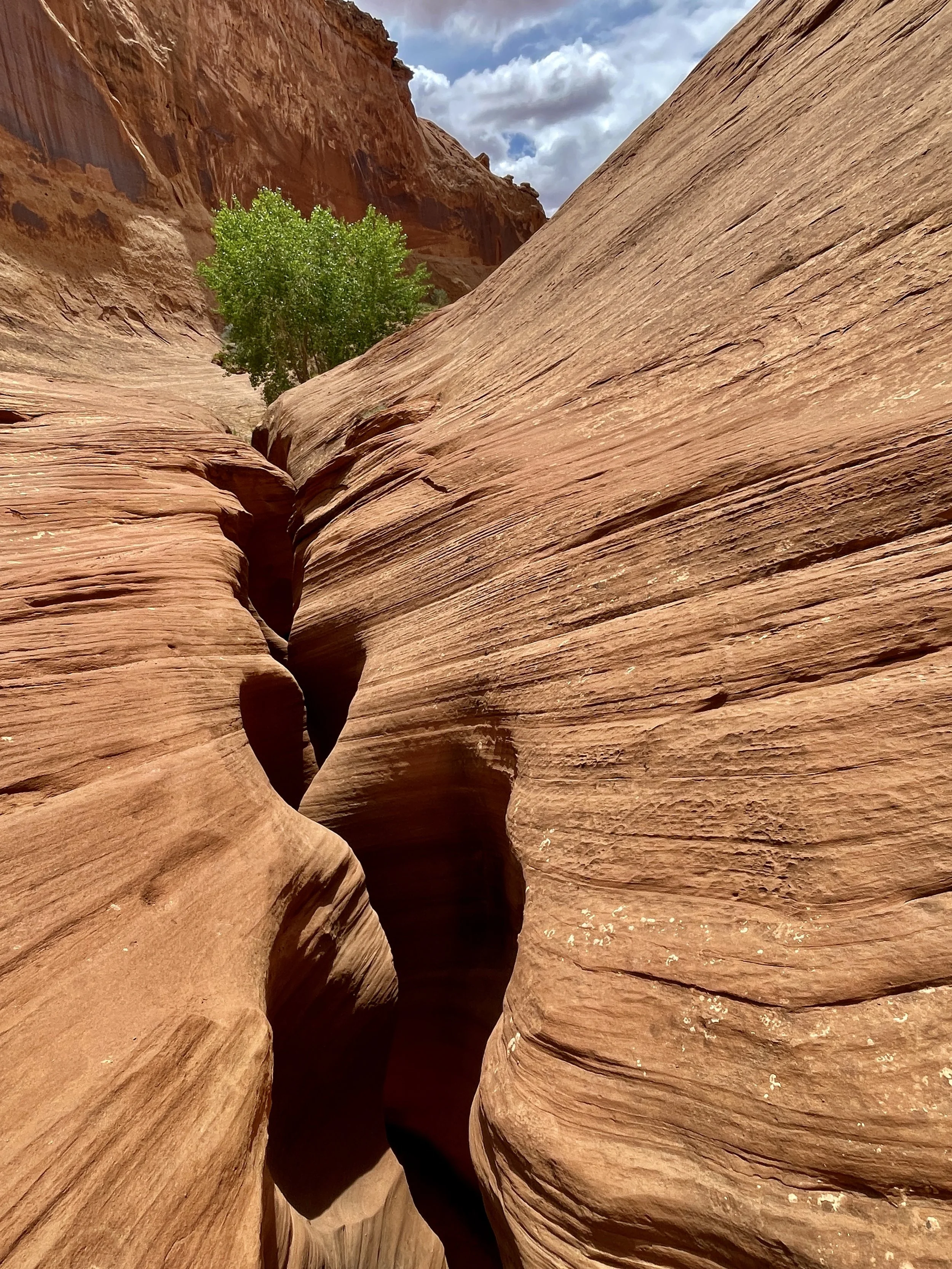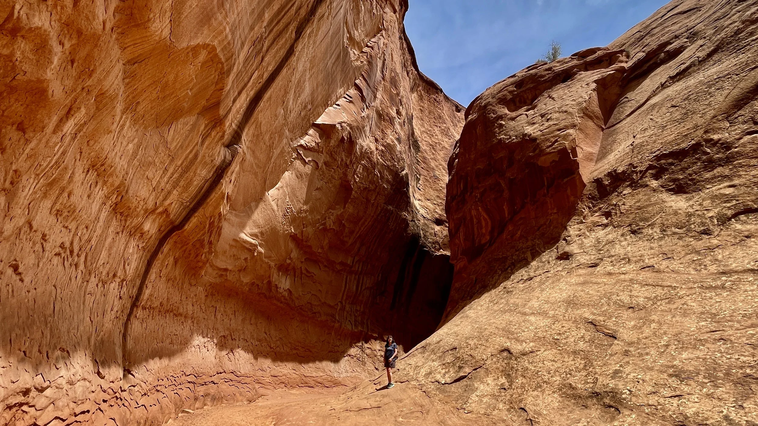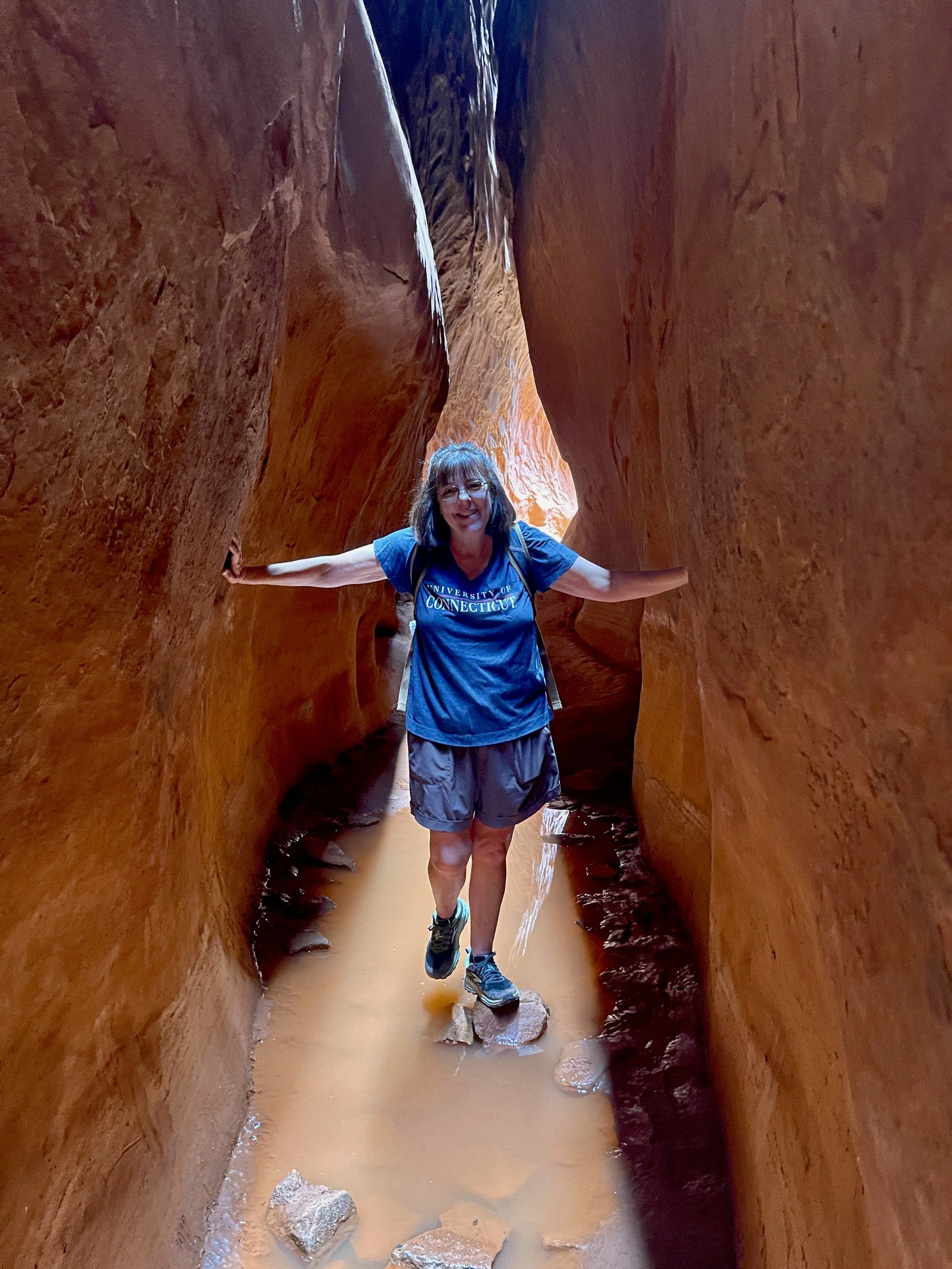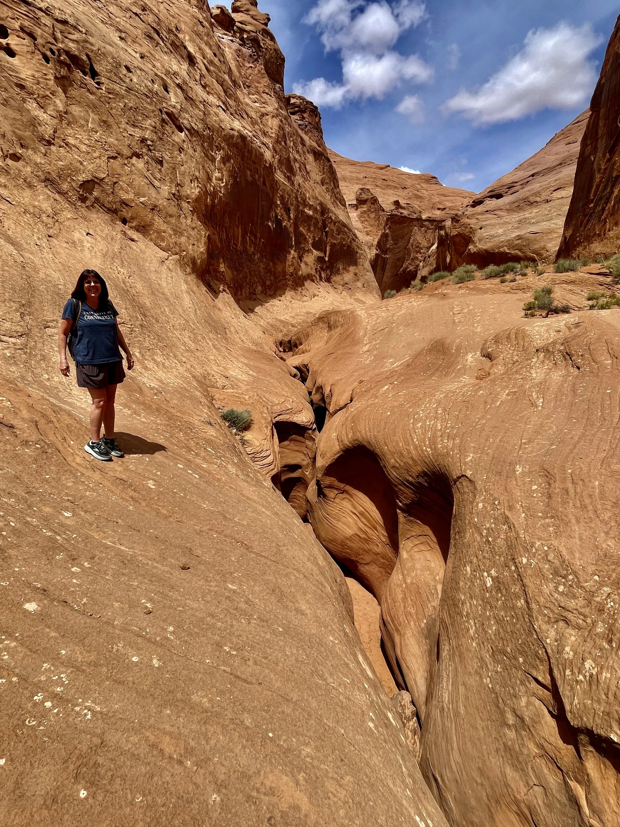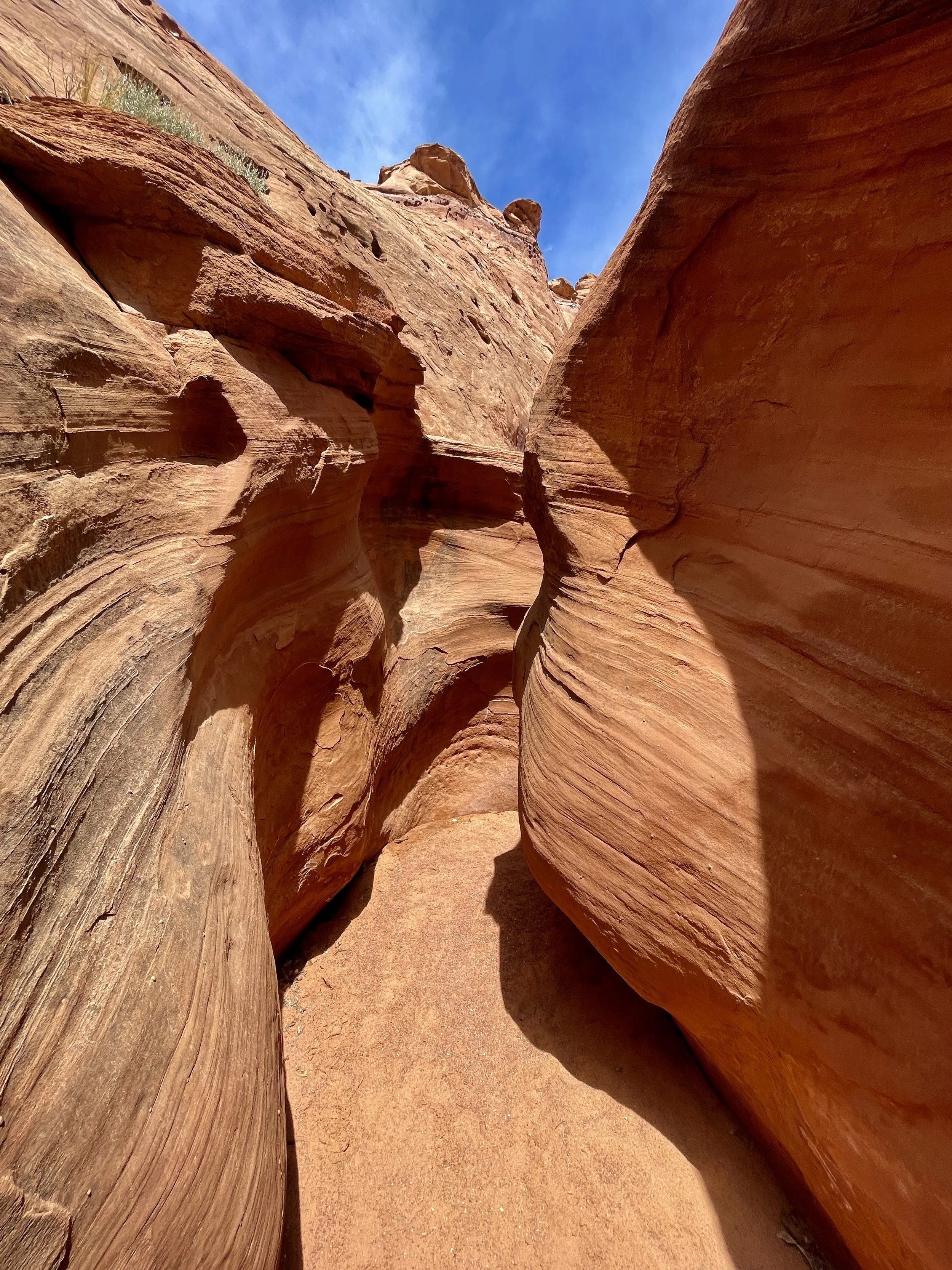After about a half mile we came to a super narrow slot. We had to take our packs off and squeeze sideways to get around the turns. We came to a chockstone that we had to climb over to continue but just beyond that was another impassable chockstone. We backtracked to the mouth of the slot looking for a possible bypass. I should have re-read the notes on this hike I was carrying that Gary had sent me but I didn’t. We found what looked to be a bypass on the right. It involved climbing a smooth, sandy steep rock and then it looked like we could hike past the obstacle. But the rock was so sandy and slippery we struggled to figure out how to get up it. Just then some guy and his daughter were coming back along that route. They said we could also try the left side. We scrambled up the slickrock on the left, went around a corner and then traversed along the slot above it on a steep downsloping section of slickrock that would drop you right into the top of the slot if you slipped. After maybe twenty yards of this the top of the slot was so narrow we jumped over the top of the canyon to the other side and from there it was clear sailing to get back in the wash beyond the narrows section. Yay! We were now past the obstacle and after saying thanks and goodbye to the guy and his daughter, we were now the only ones in Leprechaun Canyon.