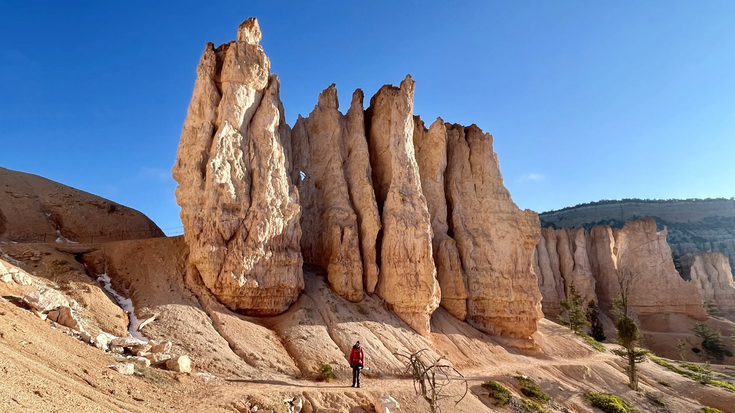 The Fairyland Loop is an 8.24 mile loop trail on the northern end of the park. Most people either start at Sunrise Point or Fairyland Point. We didn’t do either. Based on a tip I’d read, we drove into the North Campground and parked at the day use parking area. From there it is only about a fifty foot walk to get to the rim on a side trail. Since dogs aren’t allowed on the trail, Greg and Brinley had other plans. Mike, Bridgit and I stood on the rim at 7AM, just as the sun was breaking the horizon. The temperature was a balmy five degrees but we were dressed for it. More importantly, the sky was clear and it was going to be a beautiful day.