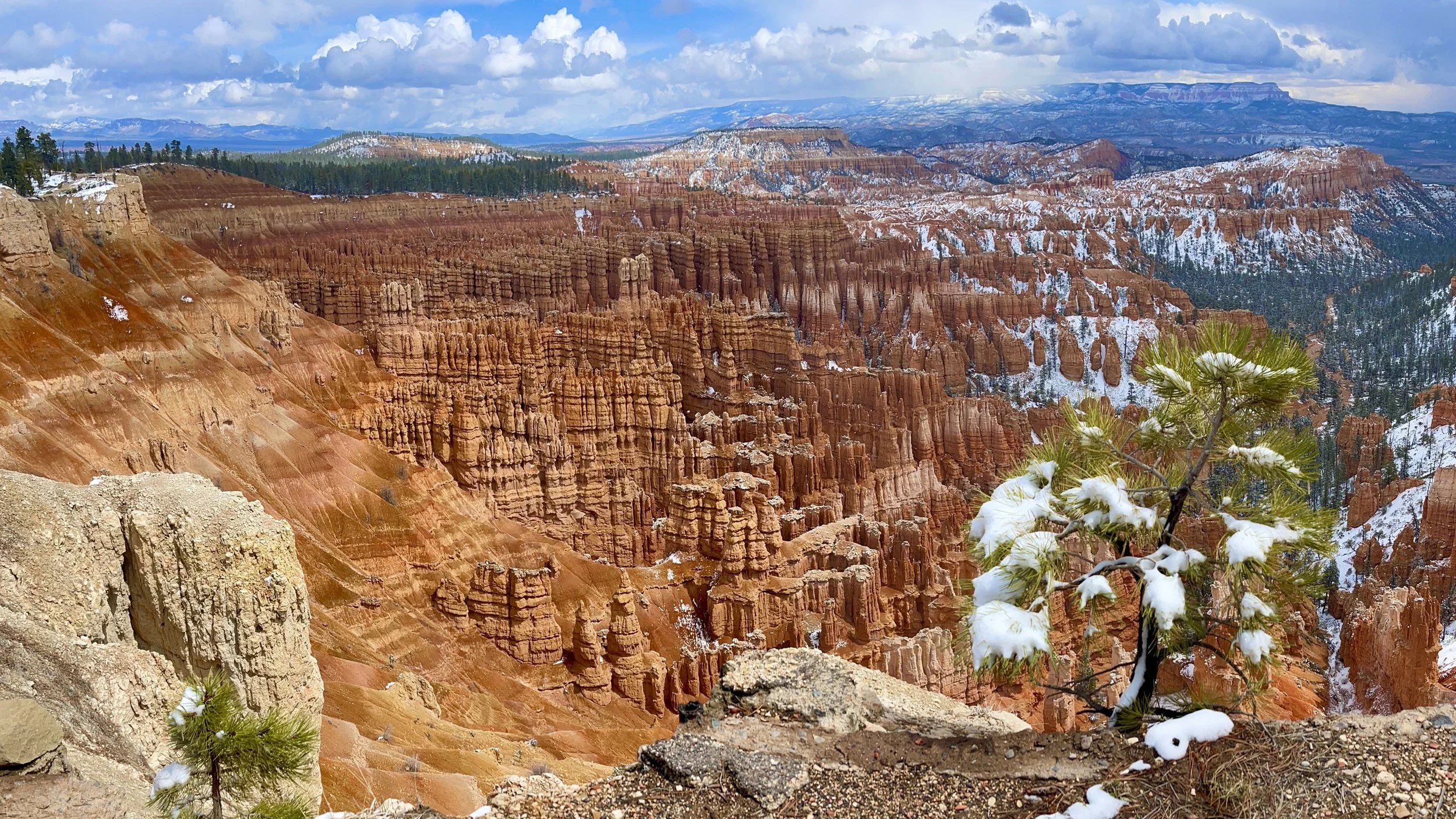 We arrived at the roundabout entrance to Bryce Canyon National Park at 11:30AM so we had plenty of time to kill before going to our reserved campground down in Cannonville. The last time we were in Bryce was our first visit. We only had one full day allotted so we shot sunrise from Sunrise Point and then hiked the Queen’s Garden/Navajo Loop. After the hike it was so crowded we just left so we really didn’t see any other parts of the park on that trip. We thought this would be a good opportunity to scope out some of the areas we planned to visit. I was eager to see several spots that had good potential for sunrise photography. I had thought that I would have good sunrise views the following morning from where we planned to start our hike so we drove to the trail start. It turned out there were a lot of trees along that part of the rim blocking the views so I decided not to shoot sunrise before our Fairyland Loop hike. Next we drove up to Inspiration Point. The short trail from the parking lot goes to Lower Inspiration Point but you can simply follow the rim up the hill to Middle and Upper Inspiration Point. We had never been to Inspiration Point and the view from the lower overlook was fantastic! Though it was still snowing, the sun had begun to break through and added to the beauty.