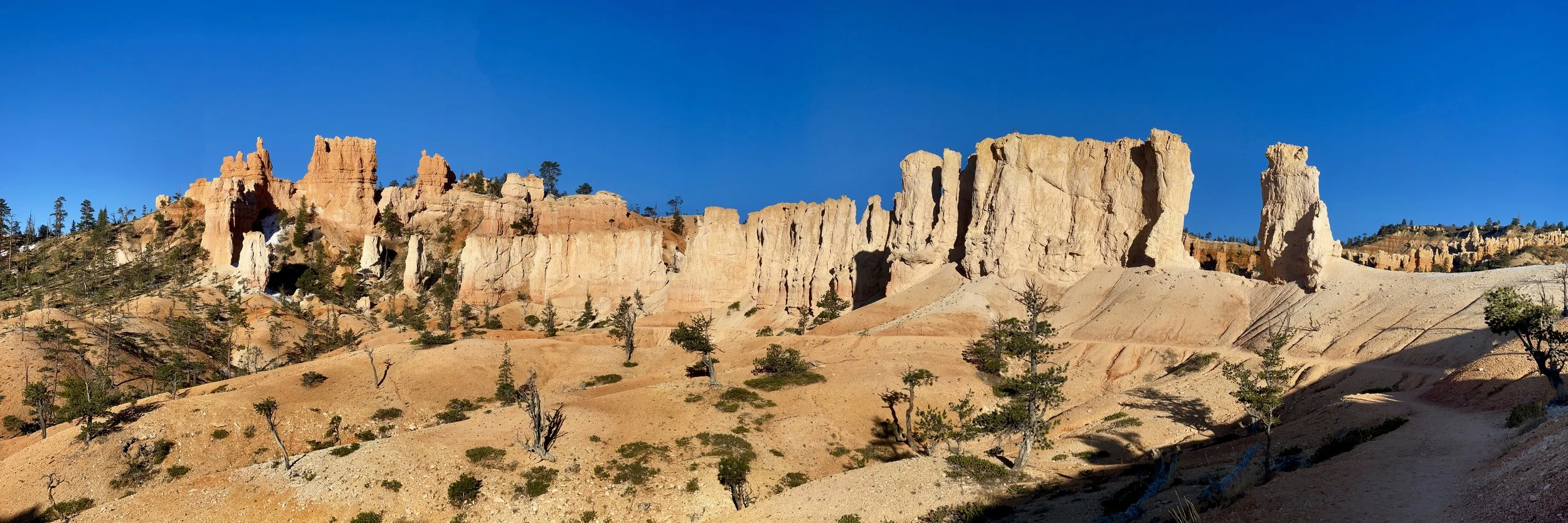 After a short walk south along the rim we came to the junction with the Fairyland Loop. Our plan was to hike it counter-clockwise which I believe is a bit easier than clockwise for elevation gain and loss. As we moved down the trail the sun began to light up the hoodoos and the further we dropped down the more hoodoos came into view. The trail wound around all sorts of rock formations and soon many opportunities for panorama shots opened up.