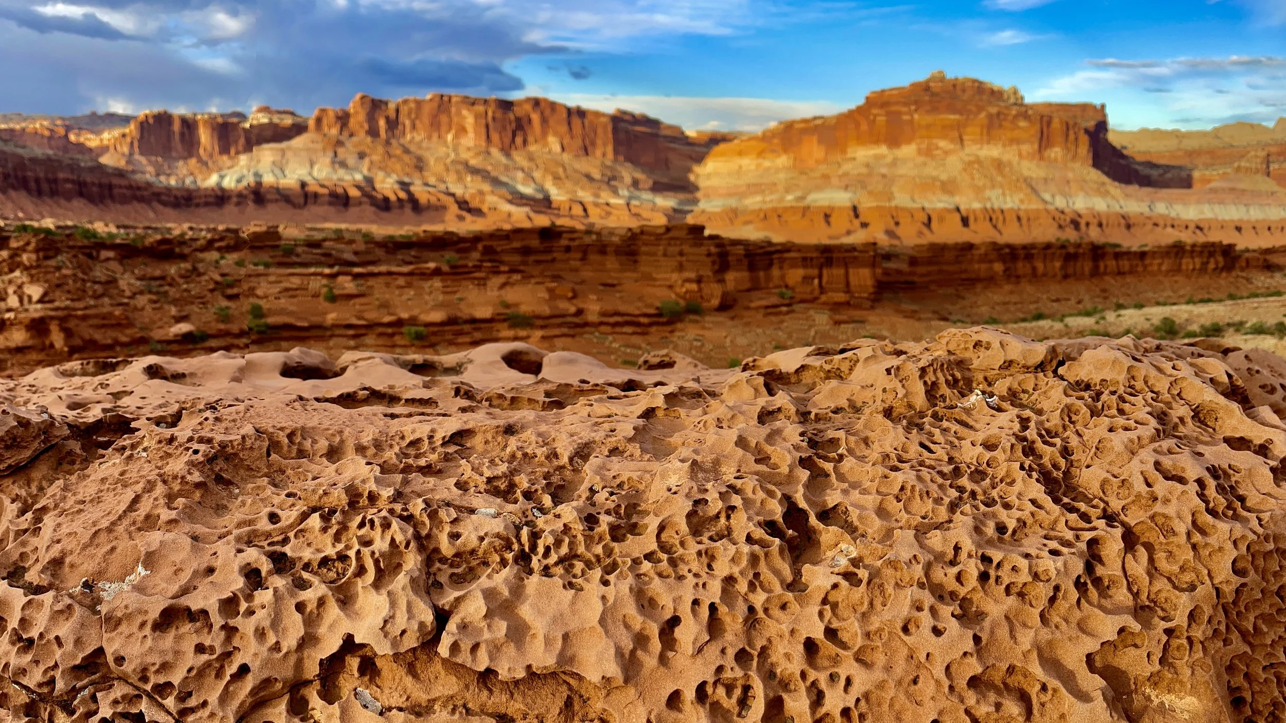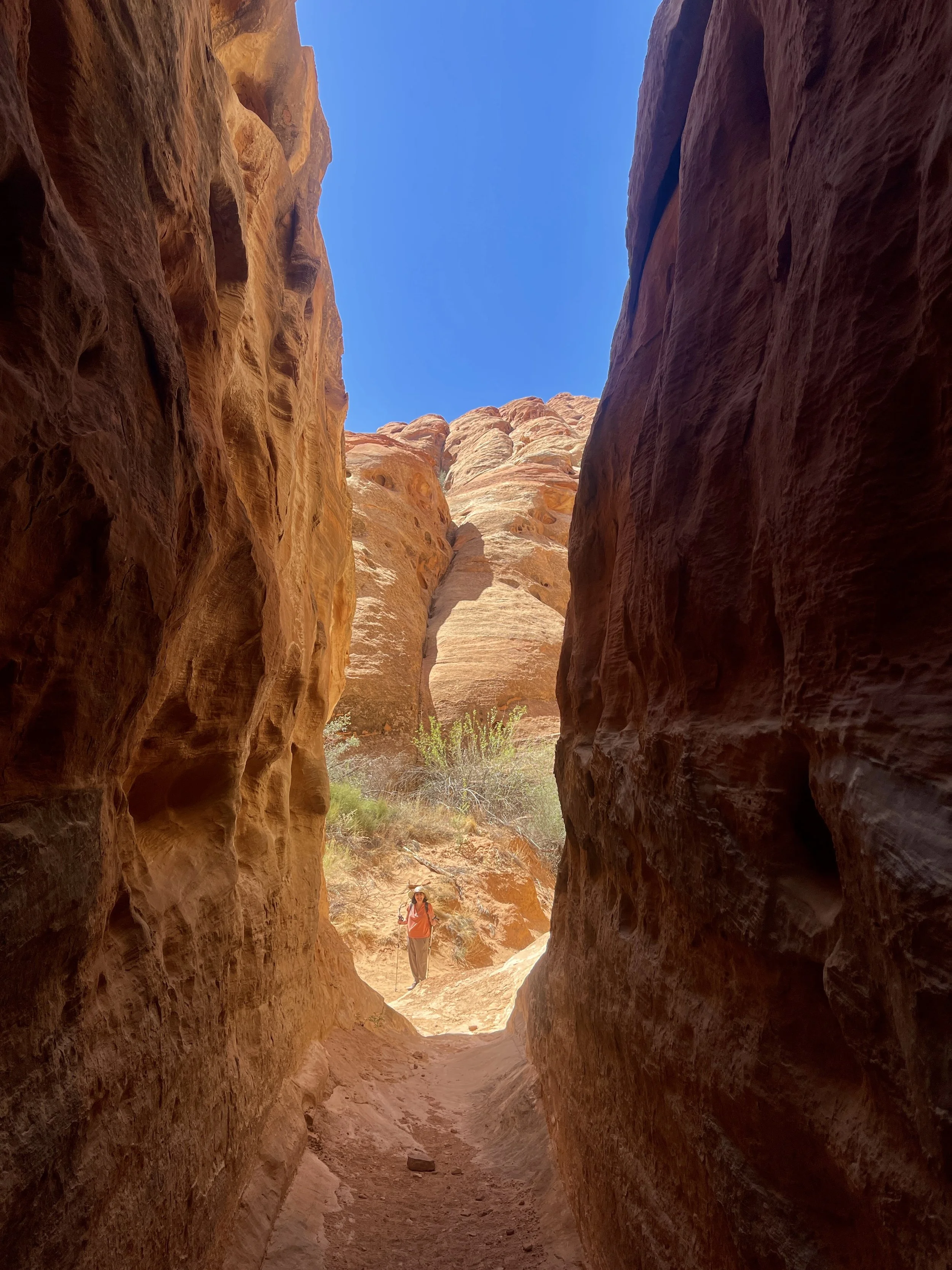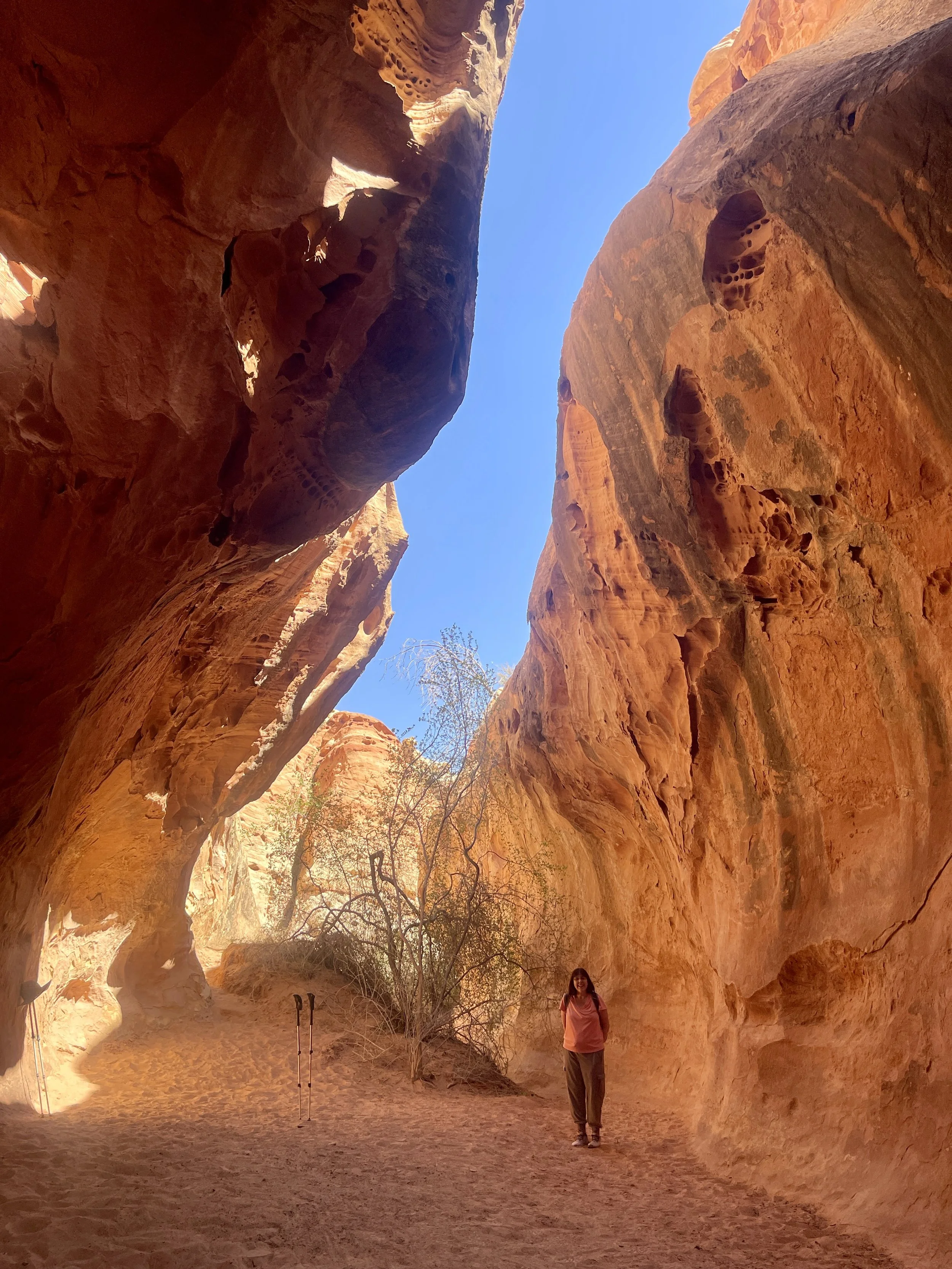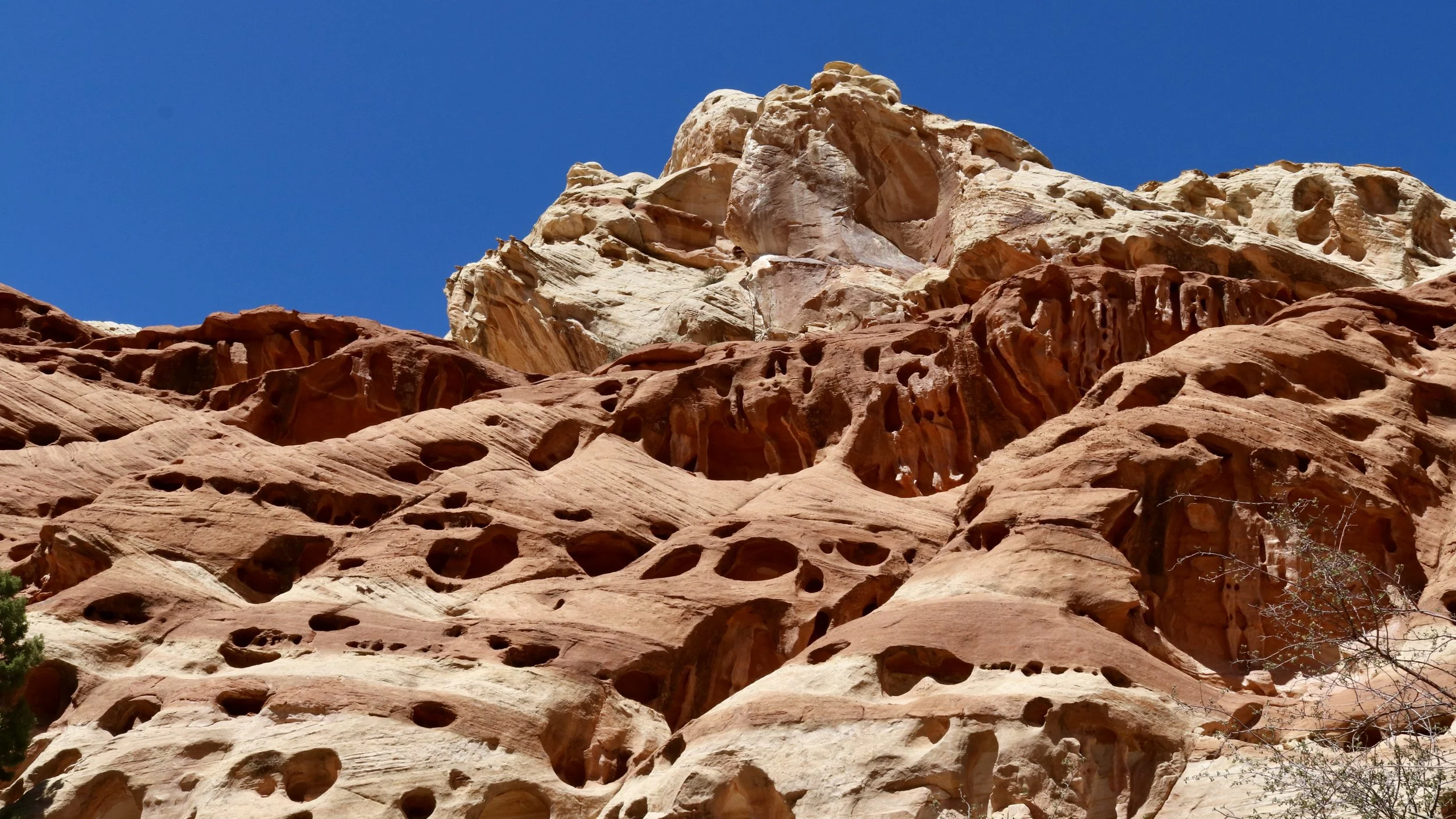 Cohab Canyon is a relatively easy 3.5 mile round trip hike. From the trailhead, we switchbacked up the side of the hill steeply until we reached the base of a cliff wall. We followed the cliff wall south until we came to an opening in the wall that provided access to Cohab Canyon. Hiking through the canyon, the walls were heavily pockmarked and there were several very short slots called the Wives. I believe we explored Wife four, five and six. The others didn’t even seem big enough to explore.