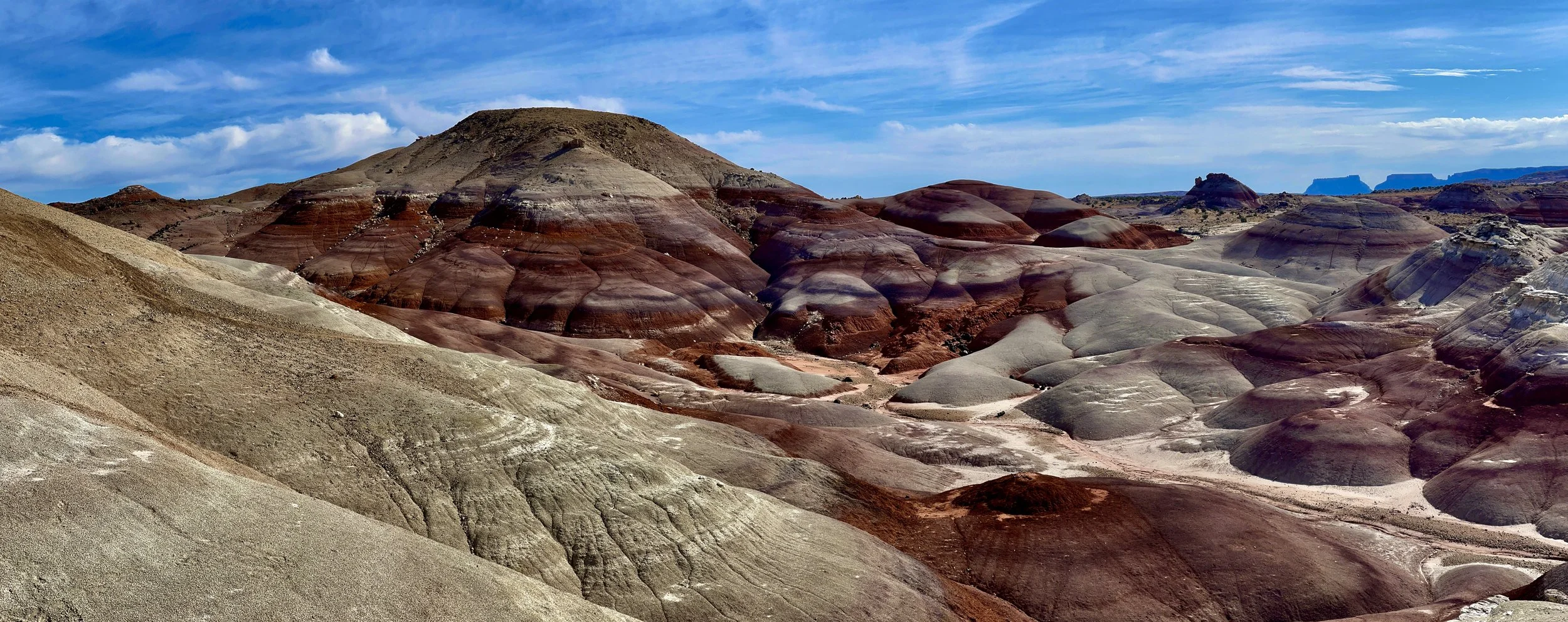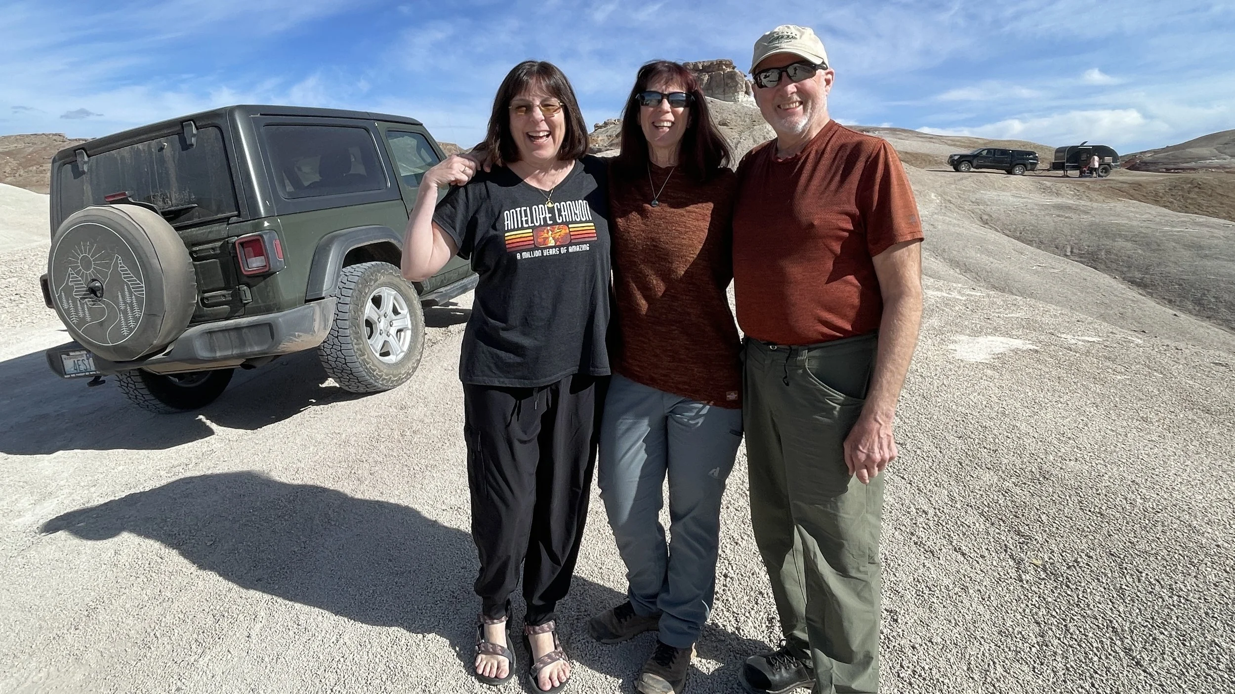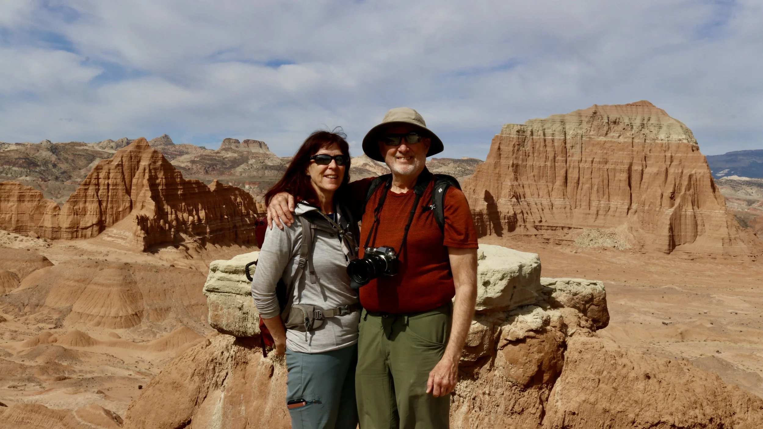 We continued on our safari through Cathedral Valley. After leaving Lower South Desert Overlook and about a mile before we got to Upper South Desert Overlook I suddenly got a low tire pressure warning. I must have driven over a sharp rock but my right rear tire was leaking fast. We limped to the flattest spot we could find. Now I had maybe read once in the manual about how to find all the tools and change the tire but had never put it to use. Cathedral Valley is not the best place to have to change a tire. But Bridgit and I are crisis veterans. After owning five restaurants for thirty years, we’ve learned how to just team up and find solutions. Power outages, broken air conditioners, Walk-in coolers on the fritz - we’ve seen it all. So before you could say sat on a cactus I had the manual open to the tire changing page, gave it to Bridgit and started pulling out the tools. She walked me through the steps and we had the spare on and ready in less than a half hour. The only problem now was that we no longer had a spare and the one we were using was a smaller tire than the rest. I didn’t want to take unnecessary risk so we scrapped plans to add an extension to our loop. We were pretty much halfway so there was no need to go back the way we came. I just drove more carefully than I typically do and we continued (insert Mike laughing).