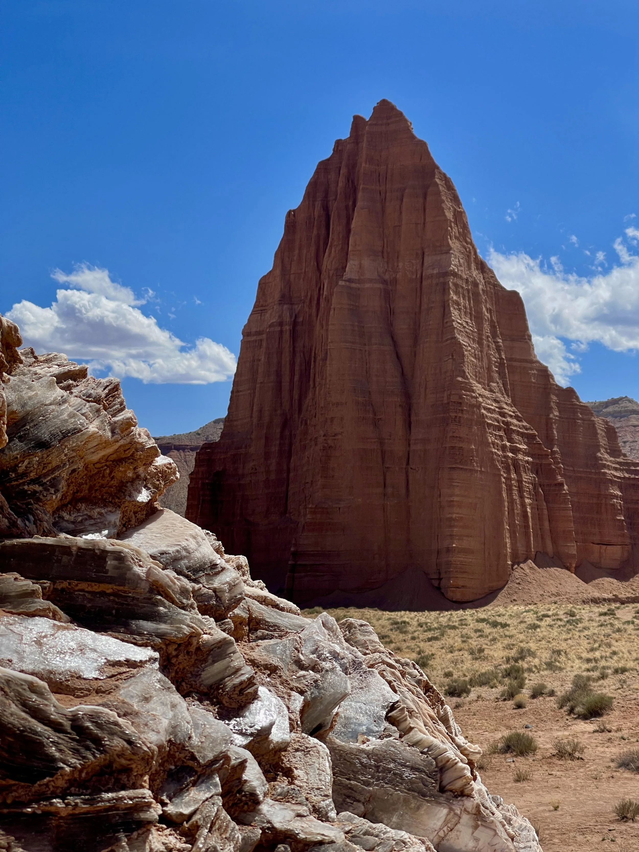 Just a short way up the road we arrived at the only campground in Cathedral Valley. It has six free first come, first serve sites. Bridgit and I camped there on our first trip through the valley in 2022. There were no other vehicles there so we stopped for lunch. Down a couple of switchbacks we stopped and hiked out a bit of the Cathedrals Trail for amazing views of Cathedral Valley’s namesake cathedrals.