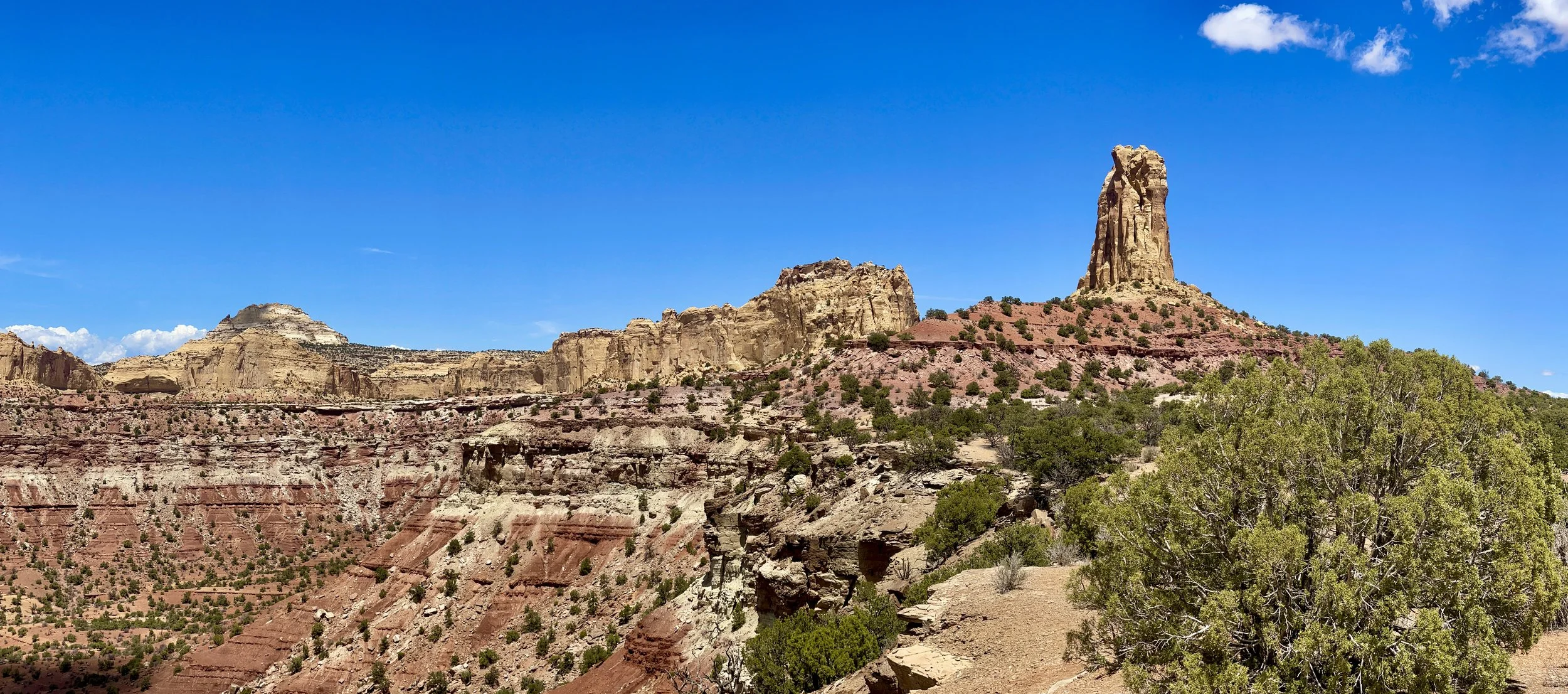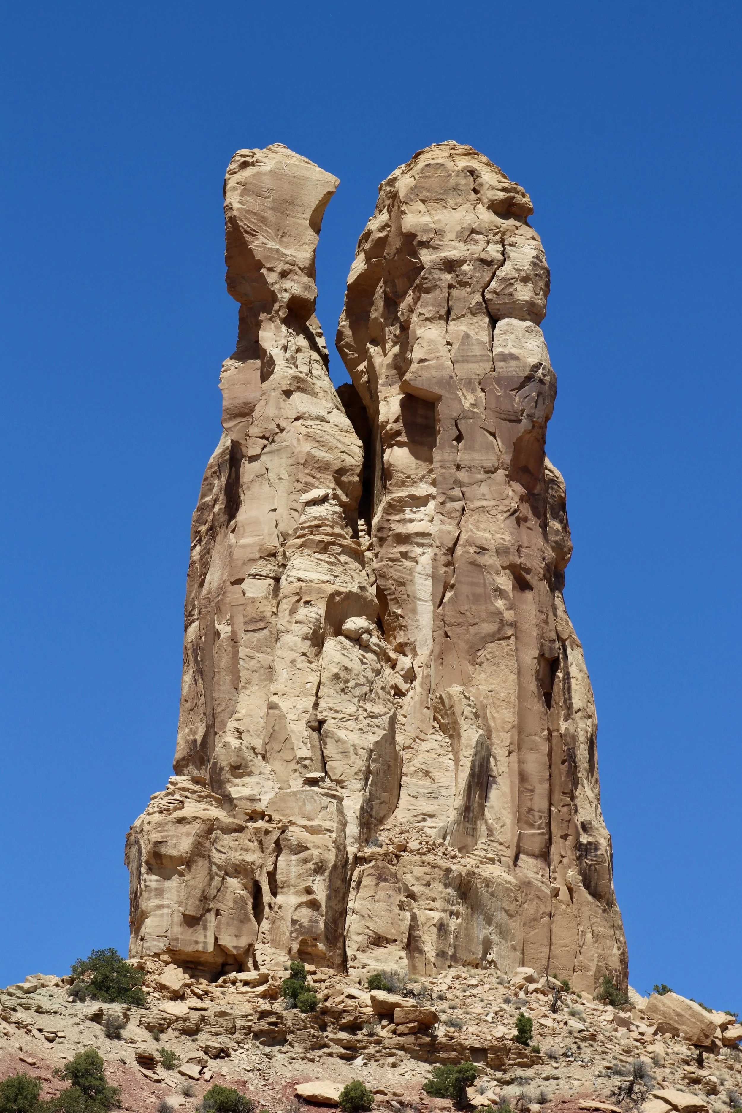 As we drove up Family Butte Road the tread got a little rougher and we needed to put it down into 4WD for one particularly steep rocky hill. At the top of the hill we rounded a corner and came upon a really nice dispersed campsite right on the rim of Reds Canyon. This would make a great jamping spot if we come back and do some further driving through this area (which we’d like to do). From the campsite it was only a few yards to Reds Canyon Overlook. There was another vehicle there with two guys and their mountain bikes. I asked them about the road going further north. They hadn’t been up that way so they didn’t know much about it other than they thought it got a bit rougher further up. They took off the way we had come in and we were back on our own. Reds Canyon Overlook provided a great view looking down the canyon to the southwest. Peakbagger picked out Family Butte, Factory Butte and Thousand Island Mountain but they were all pretty far away. The canyon itself was very beautiful and it was easy to see why it is called Reds Canyon. But what really caught our eye was right next to us. A huge tower, maybe six hundred feet tall rose up right in front of us. It was called Turkey Tower and it was very impressive, especially when the sun was on it. It had golden colored rock that really popped when the sun came out from behind a cloud.
