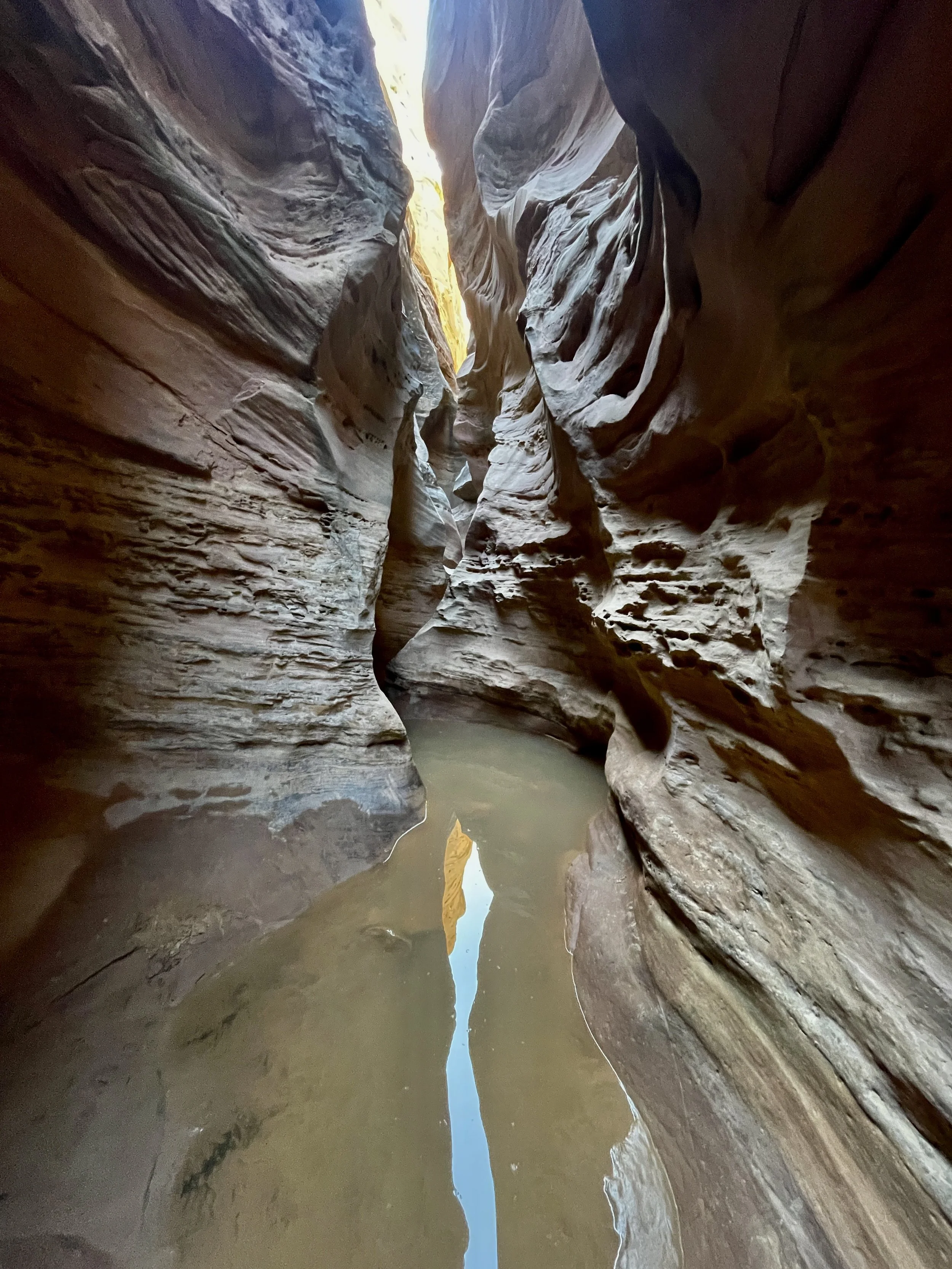 At one and a half miles we hadn’t even gotten to the real cool parts yet and we ran into a water pool. It was in a very tight narrows section. The pool was about ten feet long and I’m guessing maybe six inches deep with no possible way to get around it. We hadn’t brought our water shoes and just weren’t prepared for wading so that was the end of the hike for us. I was disappointed but I think Bridgit was relieved. It just wasn’t our day to do Little Wild Horse Canyon.