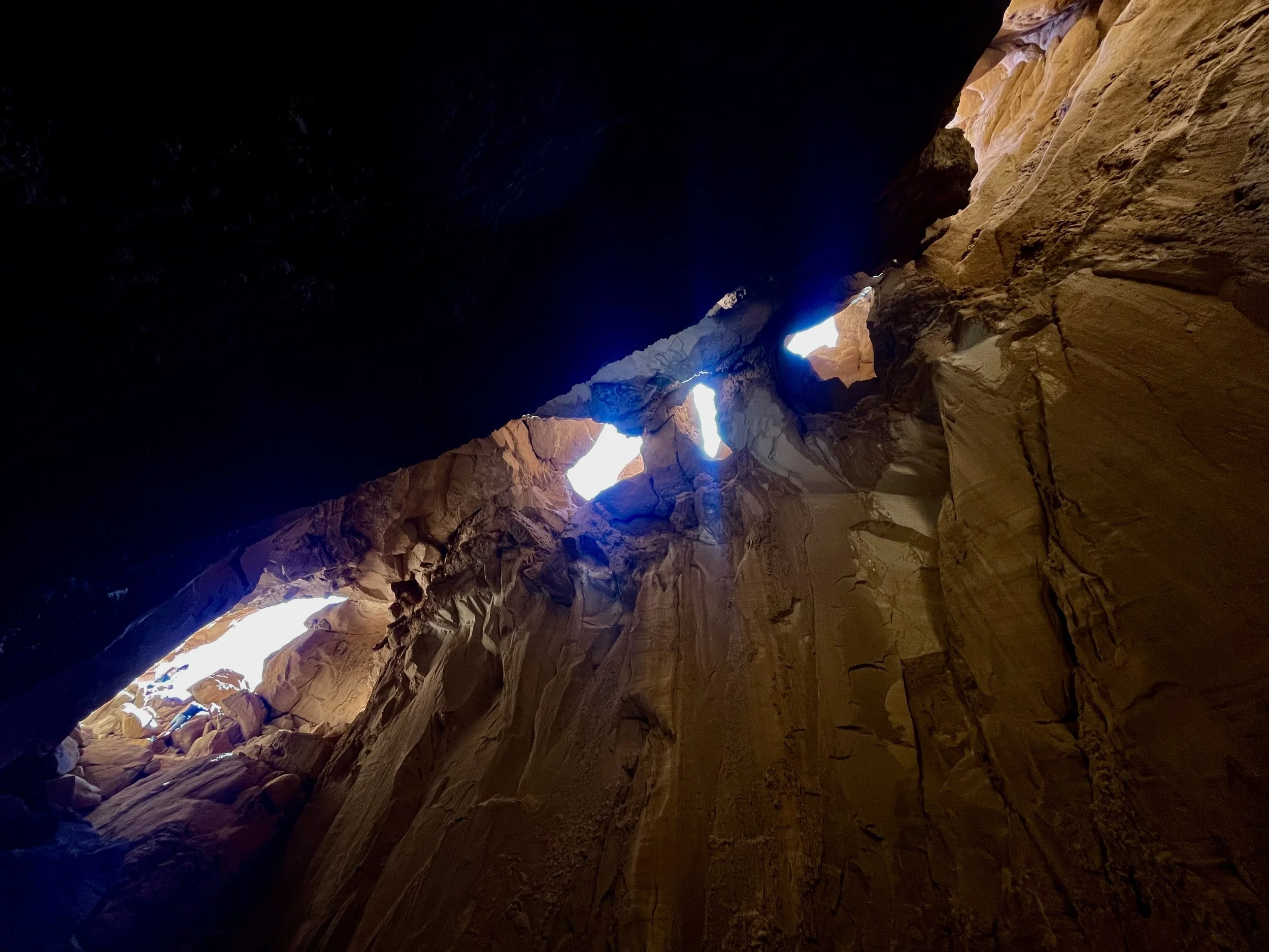 Looking up the scramble route to the very top hole from the floor of the Goblin’s Lair